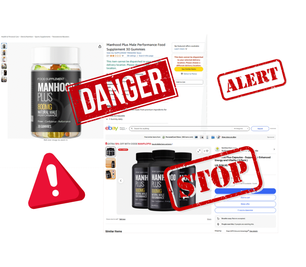 Nous recommandons vivement de ne pas commander Manhood Plus via Amazon, Walmart, eBay ou Walgreens, car ces plateformes proposent souvent des versions contrefaites avec des ingrédients complètement différents, ce qui peut être très dangereux.